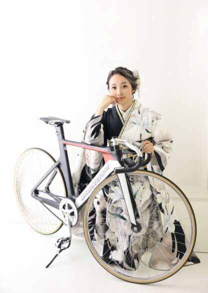 競輪選手のお嬢様、大切なレーサーと一緒に撮影しました!! 振袖の色味とも合い、赤のラインがかっこいいですね😆 ...