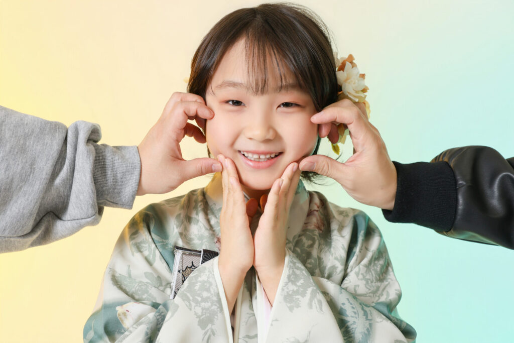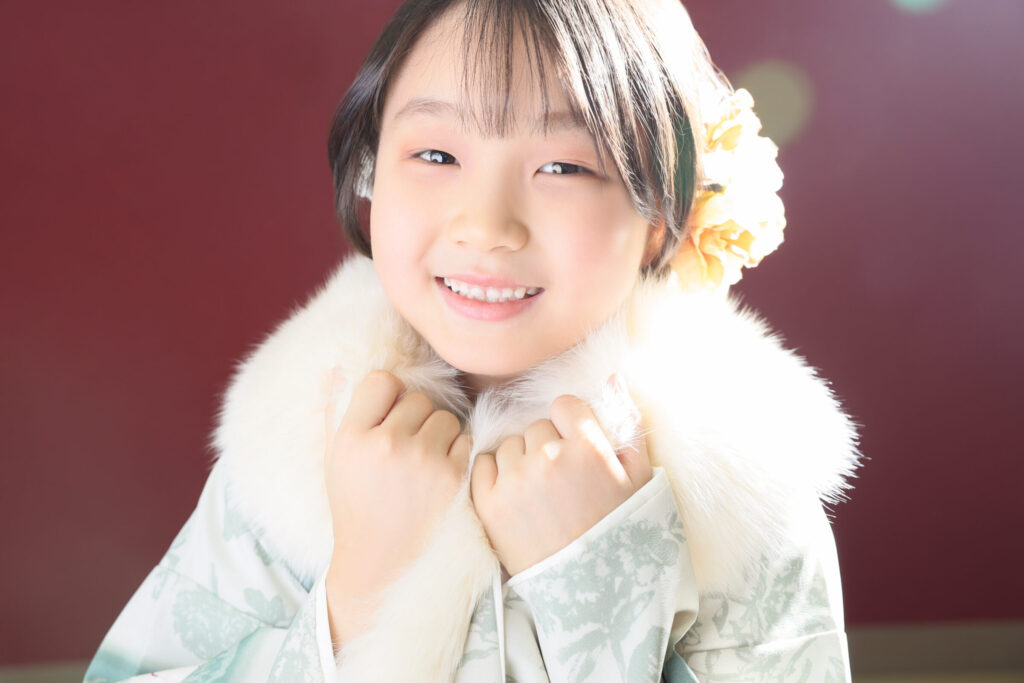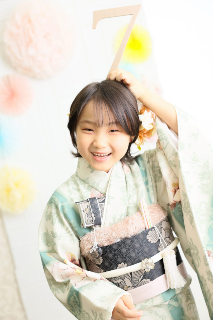 くすみグリーンのお着物がよく似合う7歳のお嬢様✨