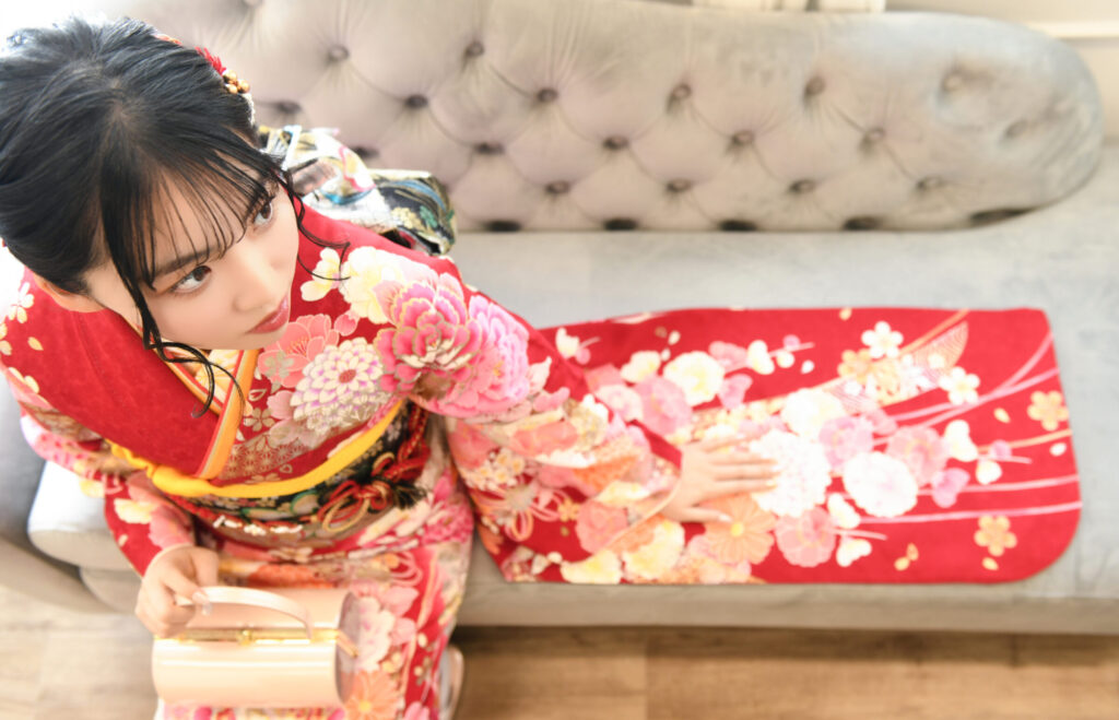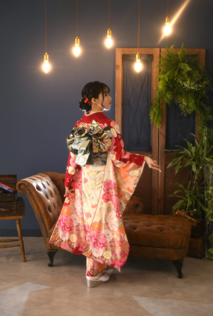 赤地に可憐に咲き誇る大輪の花々が描かれたデザイン♡