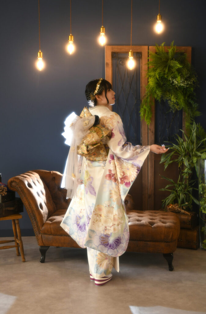 柔らかい色味に菊や牡丹の花模様が華やかに描かれた振袖