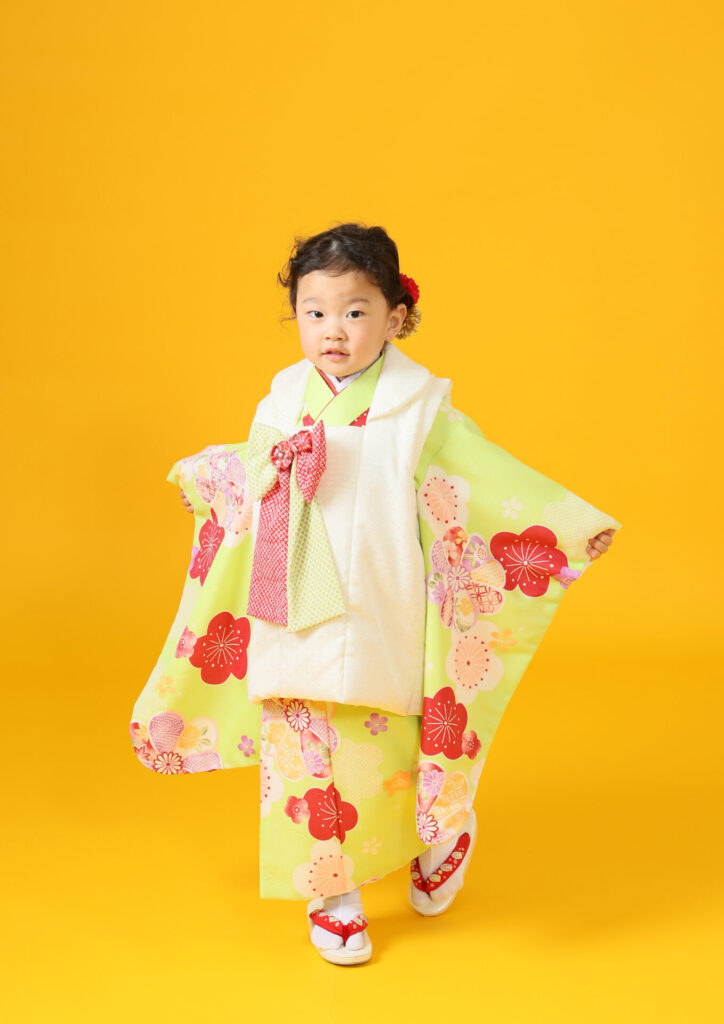 黄緑のお着物×黄色のポップな背景が相性抜群!🍀