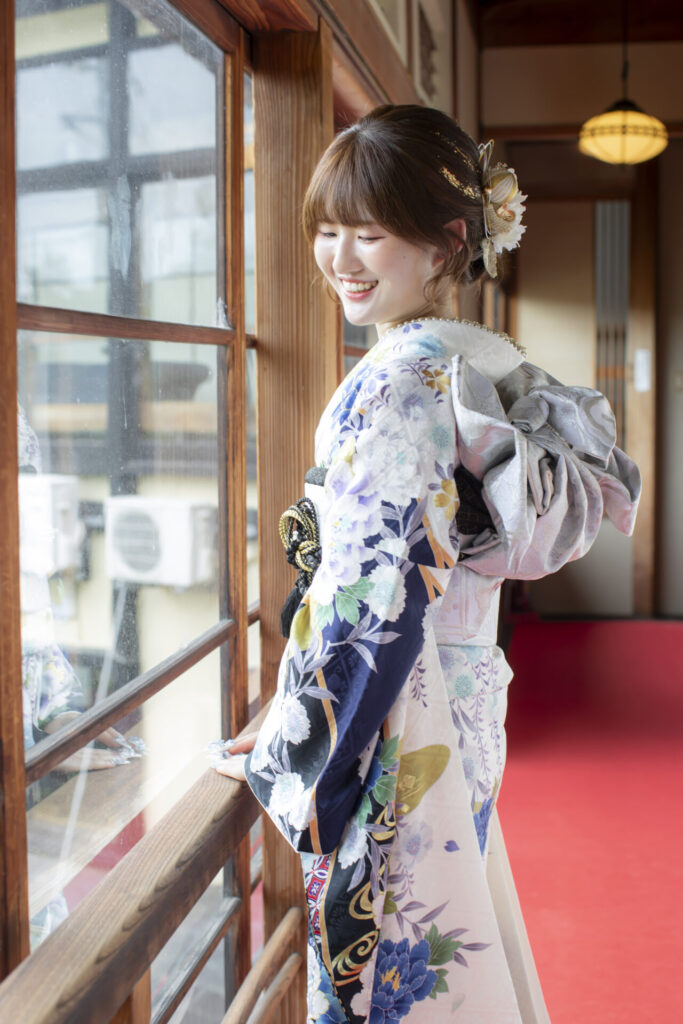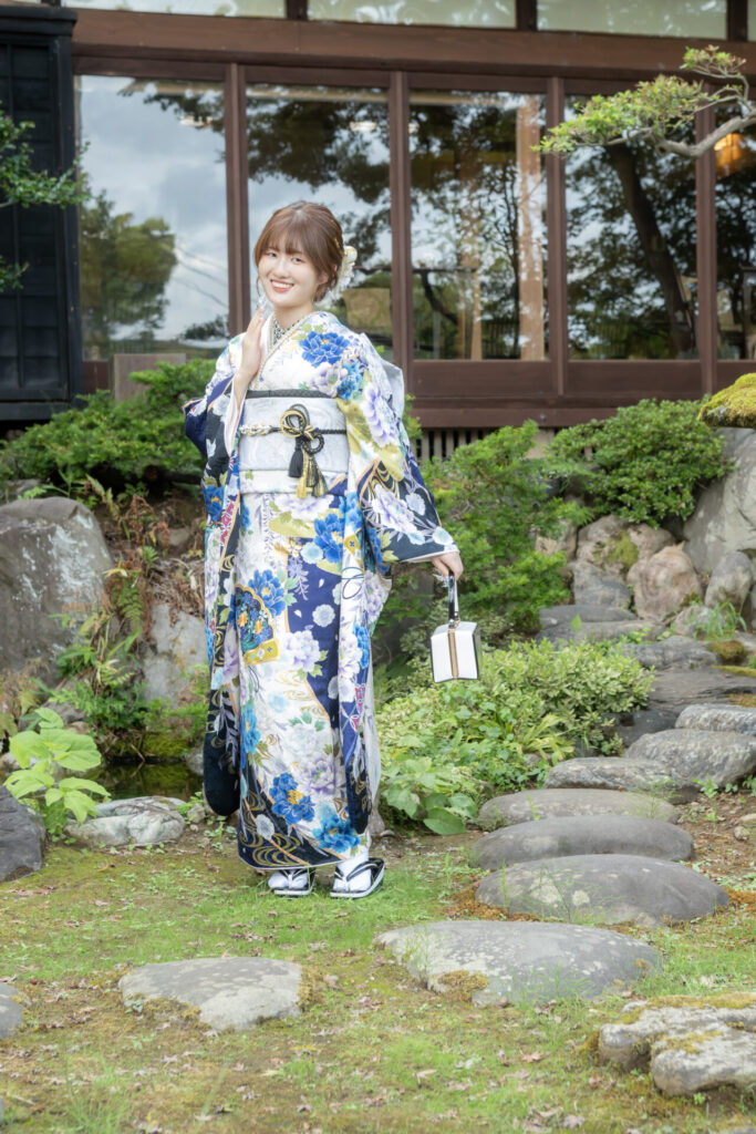 白地に青がたくさん入ったお振袖が、とても映えて素敵ですね✨