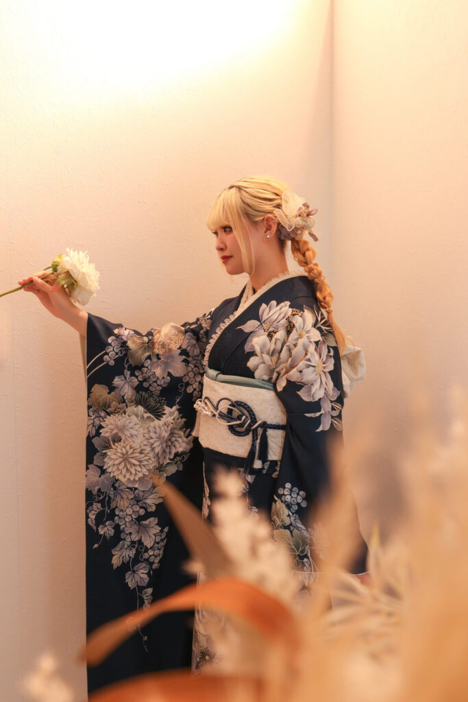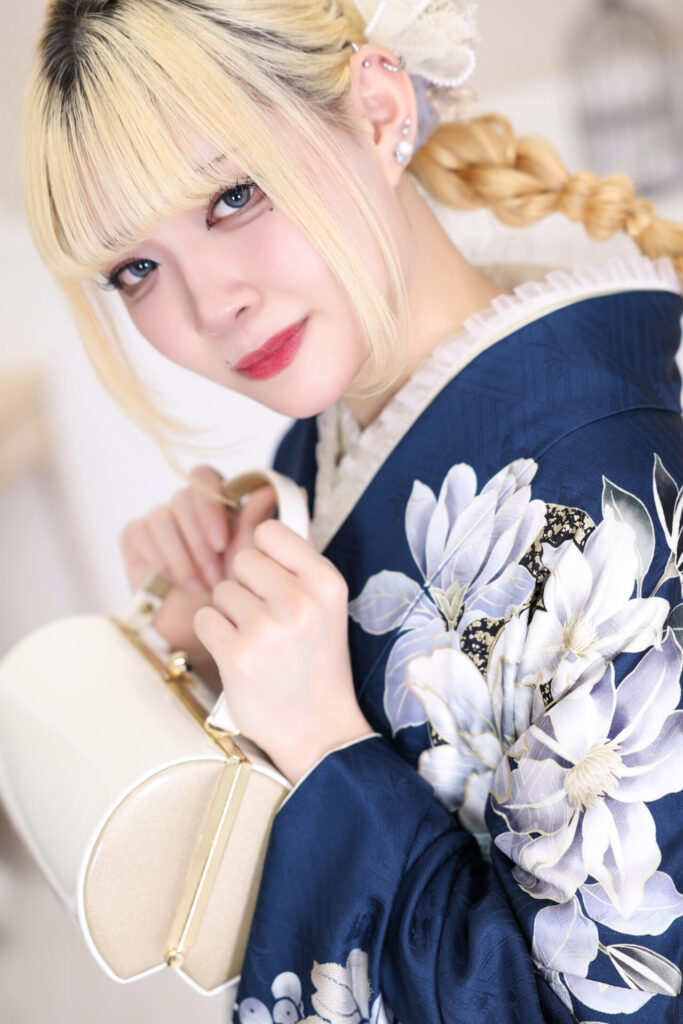 本日は青地に白いお花がたくさん入ったお振袖を、綺麗に着こなしてくださったお嬢様をご紹介します!
