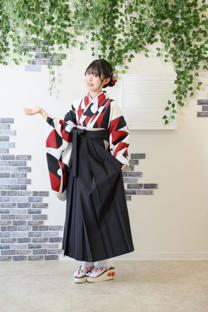 こちらのお嬢様も幾何学模様の二尺袖を使ったコーデがオシャレですね💕