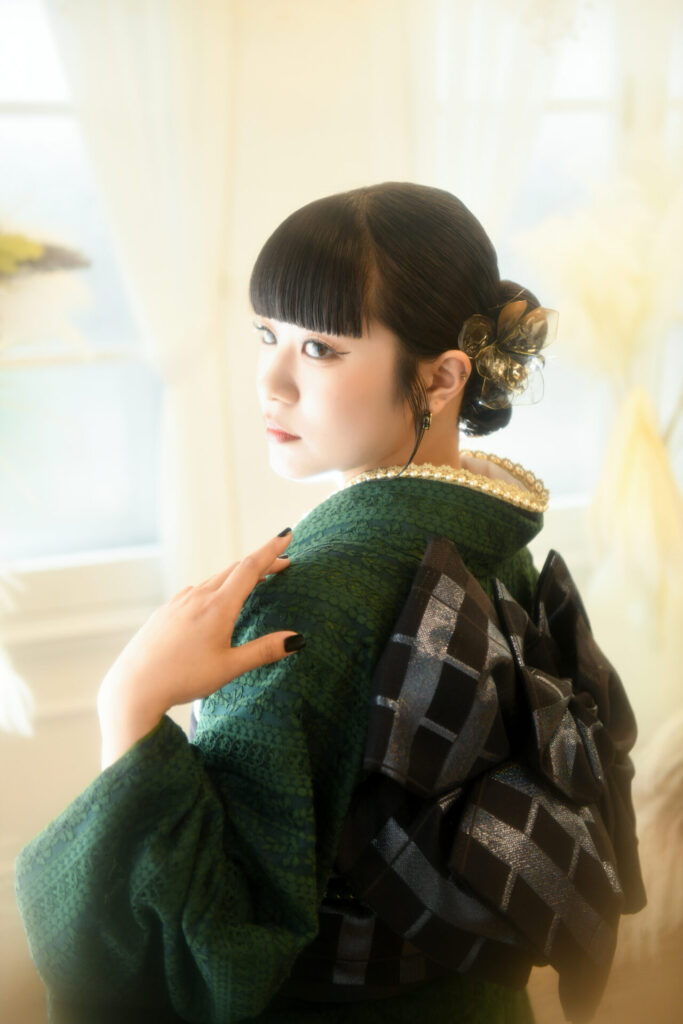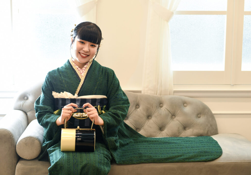 ソファでのカットでは優しい笑顔が振袖の深緑をふんわり調和。