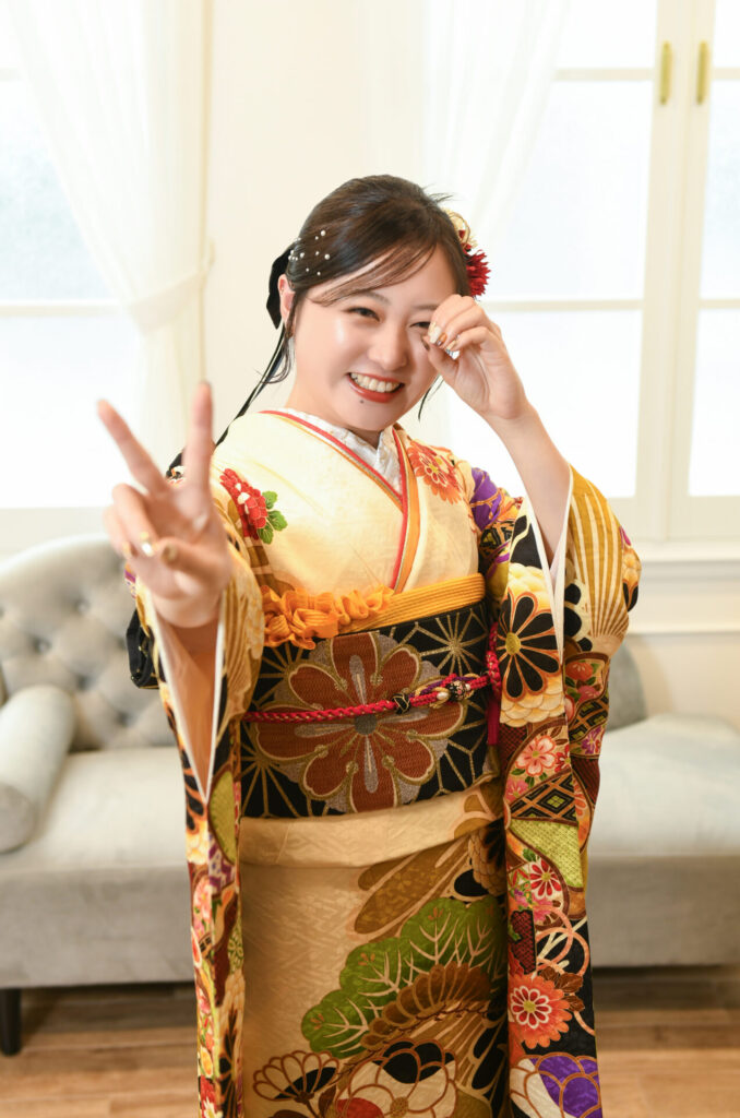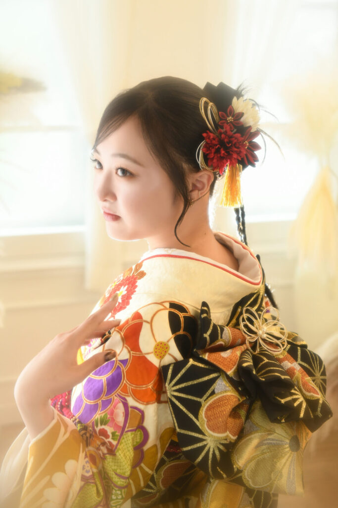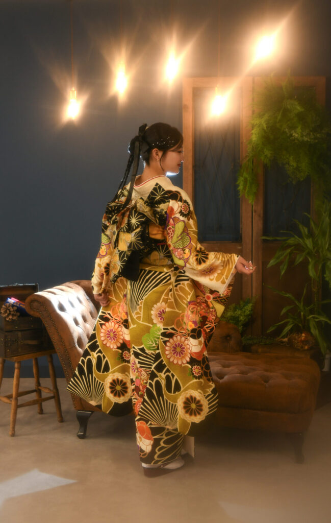 振袖の華やかさを引き締めながらも、金糸の煌めきが撮影シーンに
