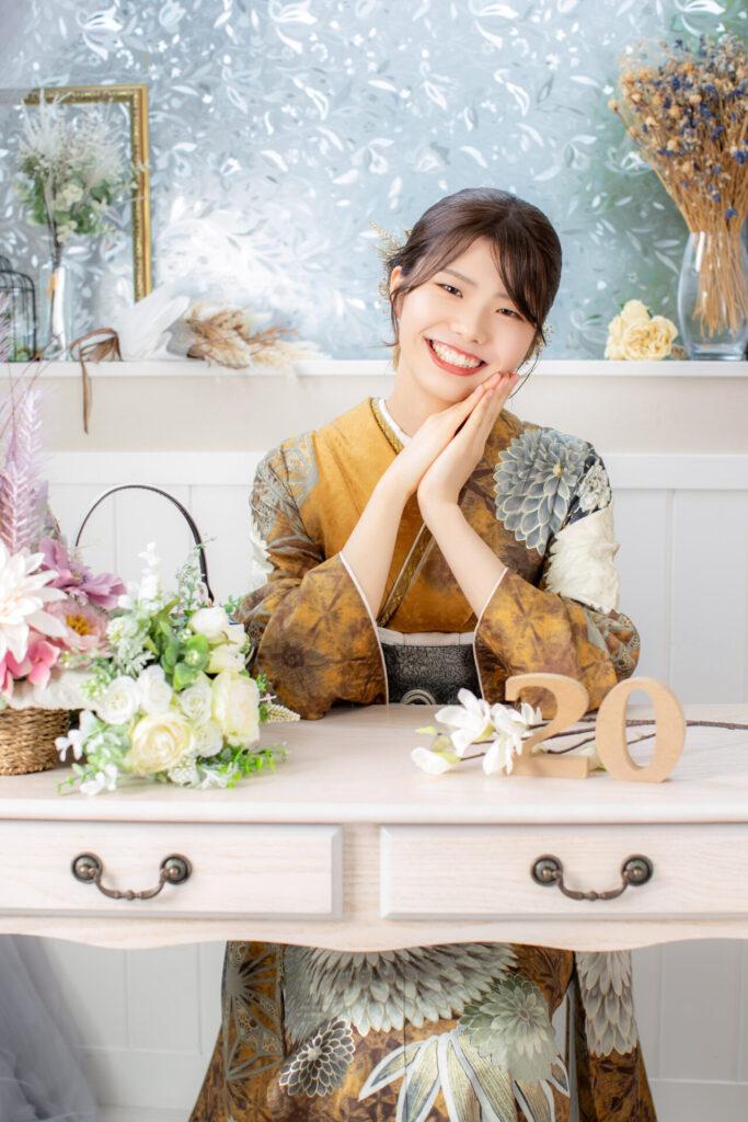 深みのあるからし色に、白いお花がたくさん入った華やかなお振袖が、