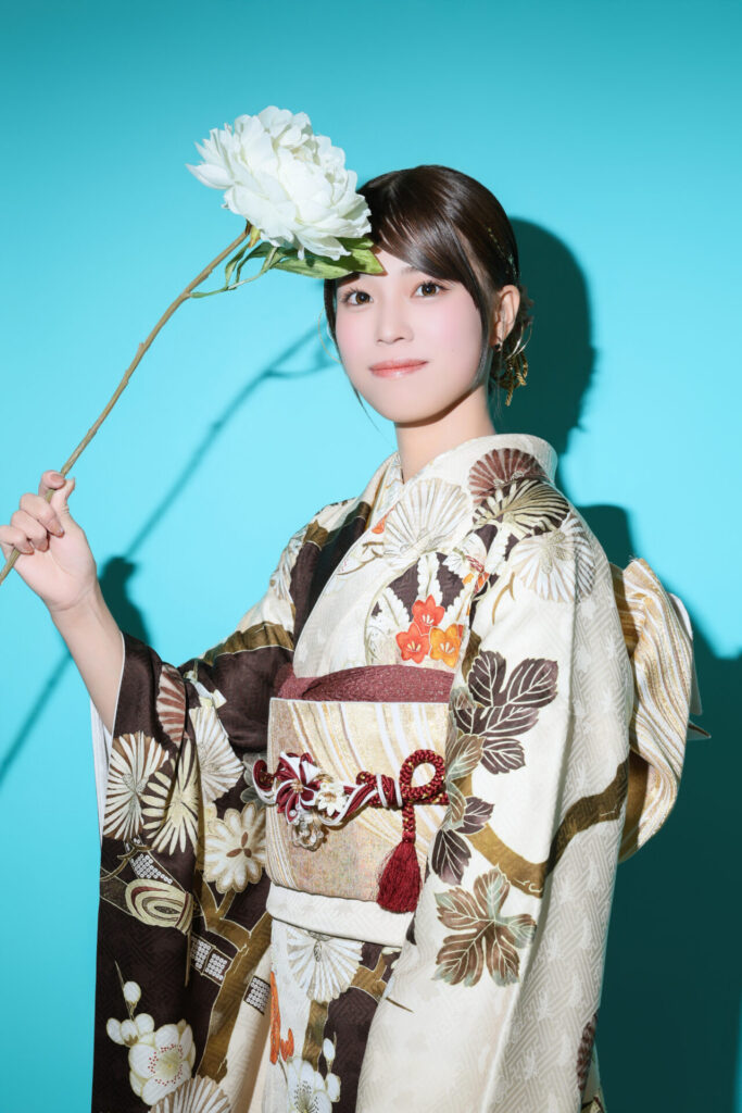 アイボリーと茶色に差し色のエンジがとても上品で、お振袖のモデルさんのように素敵ですね✨