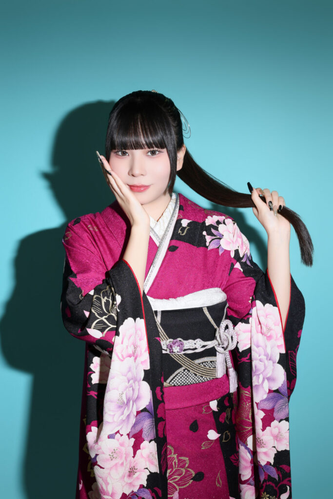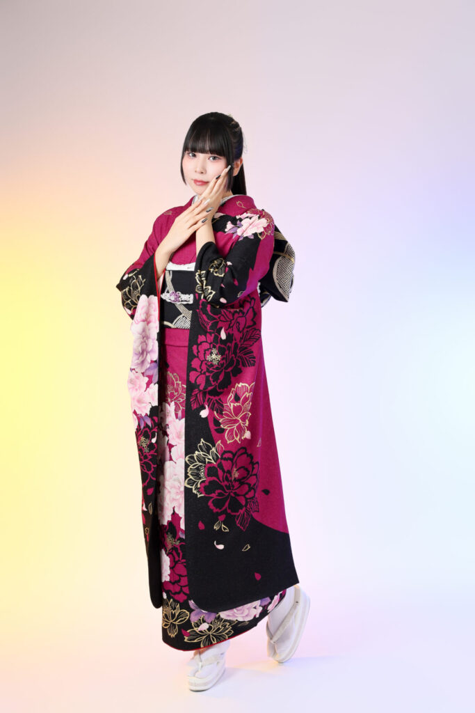 赤紫に大人グラマラスな柄で、黒がアクセントになっているお着物です✨