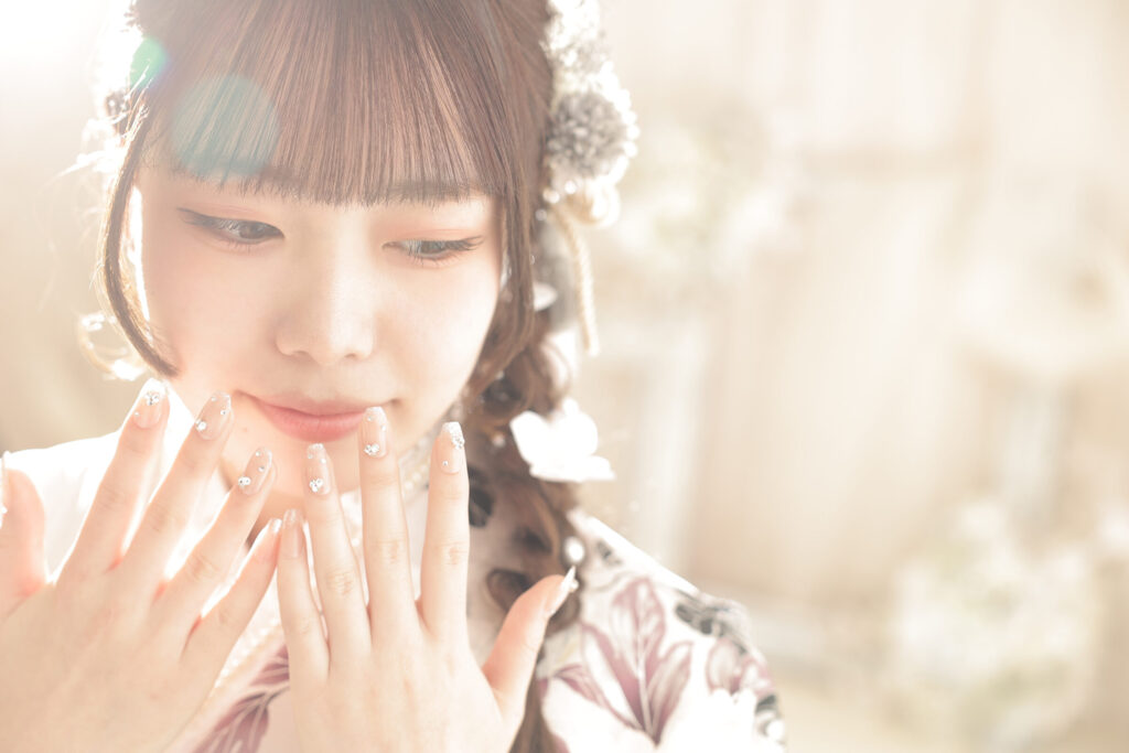 キラキラネイルで振袖との統一感もあって