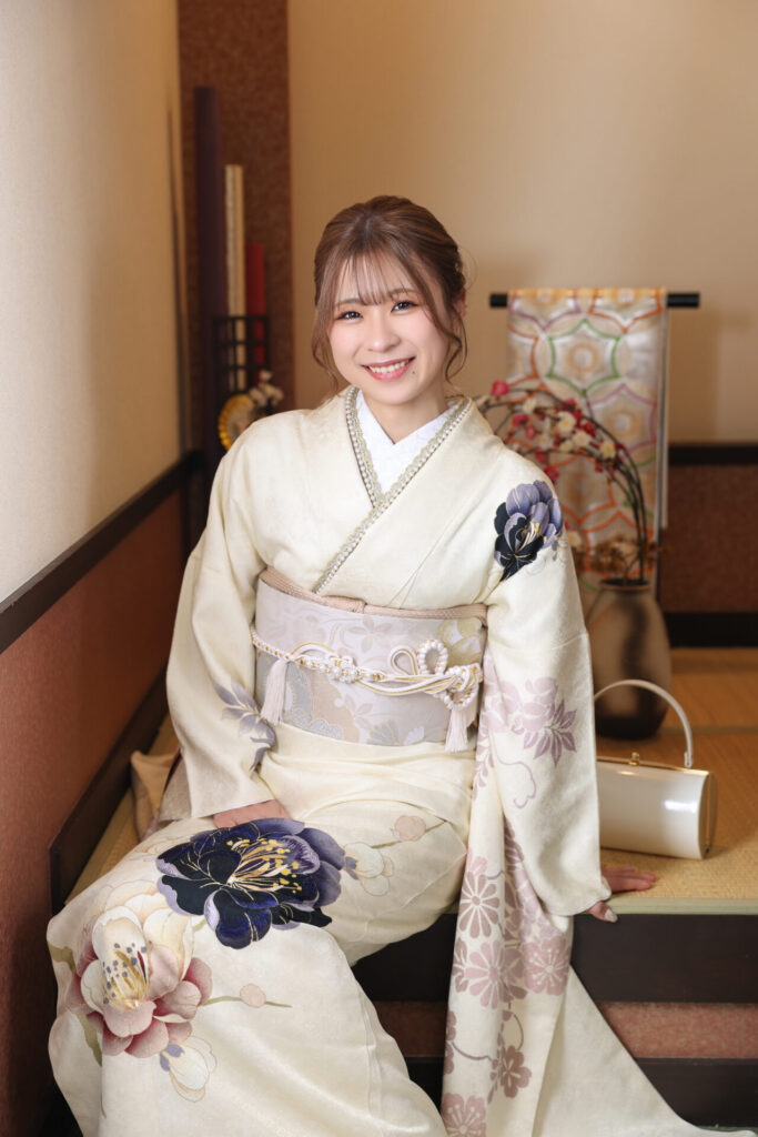 白地に紫とピンクのお花が入ったお振袖を綺麗に着こなしてくださいました♥