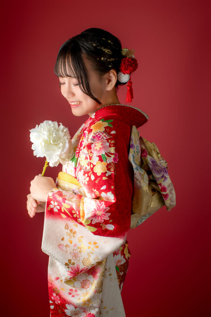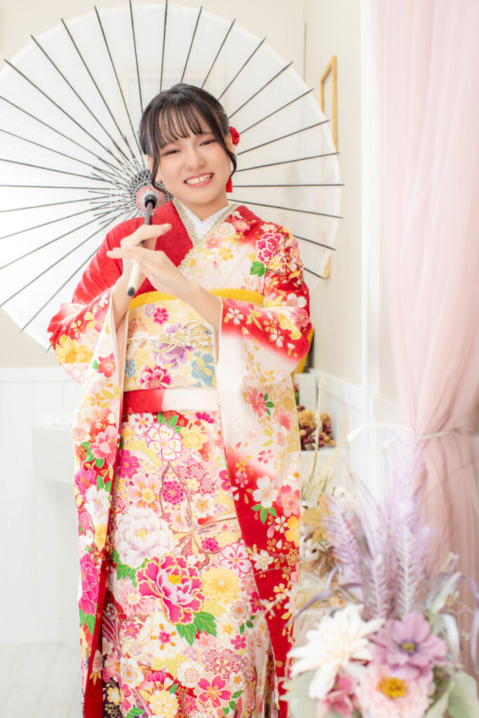 白×赤の振袖に華やかなお花がたくさん入ったお振袖を、綺麗に着こなしてくださいました♥