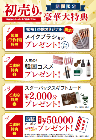 ご予約の上、親娘でご来場の方には メイクブラシセット をプレゼント🎁 さらに!! ご成約の方には人気の 韓国コスメもプレセント🤩 さらにさらに!! ご成約の方には 人気コーヒーショップギフトカード 2,000円分 サービス🤩